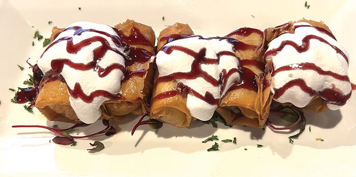 Despite being full, we wanted to try one of the two featured desserts that night, a brie cheese wrapped in wontons and deep fried to a golden crisp then covered with homemade whipped cream and raspberry drizzle. It was an ooey-gooey delicious dish.