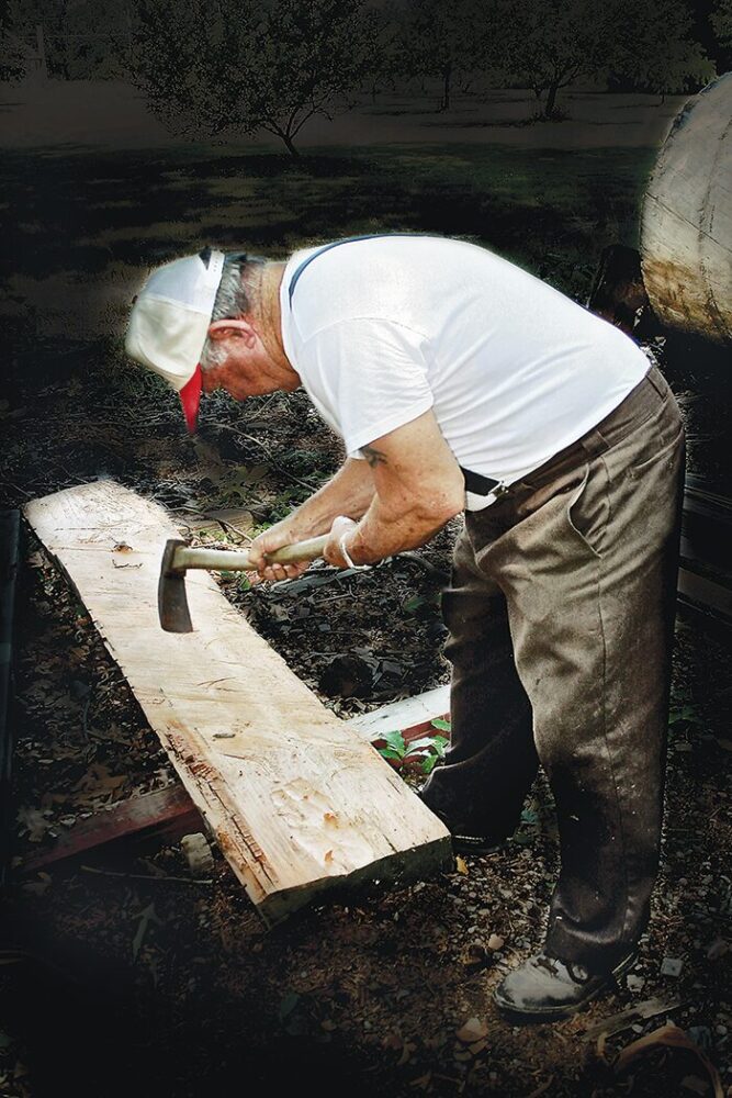 Charlie used an ancient type of ax called an “adz” to shape the logs. It resembles a gardening hoe but its sharp blade is used to trim and shape timbers. The “foot adz” is also known as a shipbuilder’s or carpenter’s adz. He also was keen with a bandsaw.
