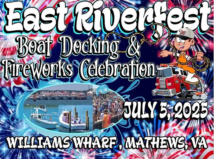 East Riverfest, starting at 11 a.m., 1039 Williams Wharf Road, Mathews. Extreme boat docking contest, music, food, Kids Zone, fireworks. Proceeds benefit Mathews Volunteer Fire Department. $35 adults, ages 10 and younger free.