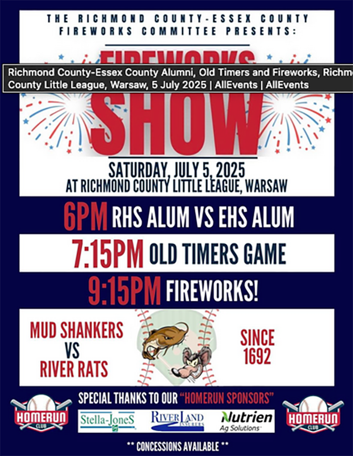 Richmond County-Essex County Fireworks, 6-9:15 p.m., Richmond County Little League, 321 Community Park Drive, Warsaw. 9:15 p.m. fireworks show preceded by Alumni and Old Timers softball games at 6 pm and 7:15 p.m.